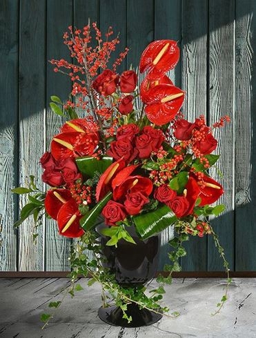 25 Adet Kırmızı Gül ve Kırmızı Antoryum ile Hazırlanmış Şık Vip Arajman